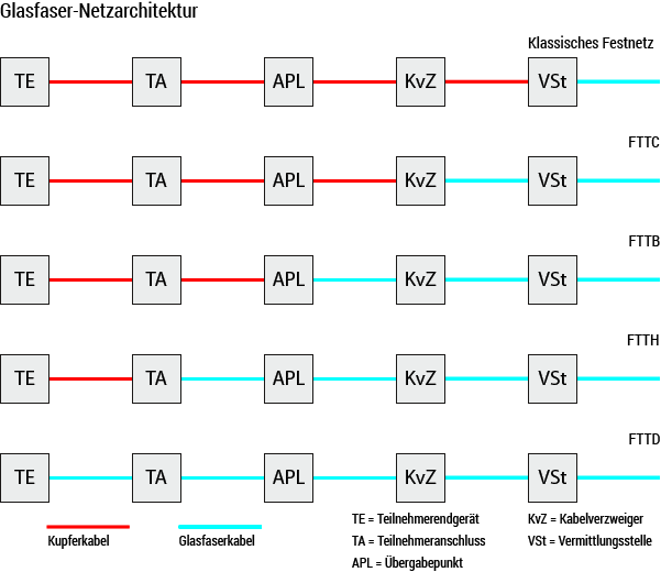 - FTTH - Fibre-to-the-Home (Glasfaser bis in die Wohnung)